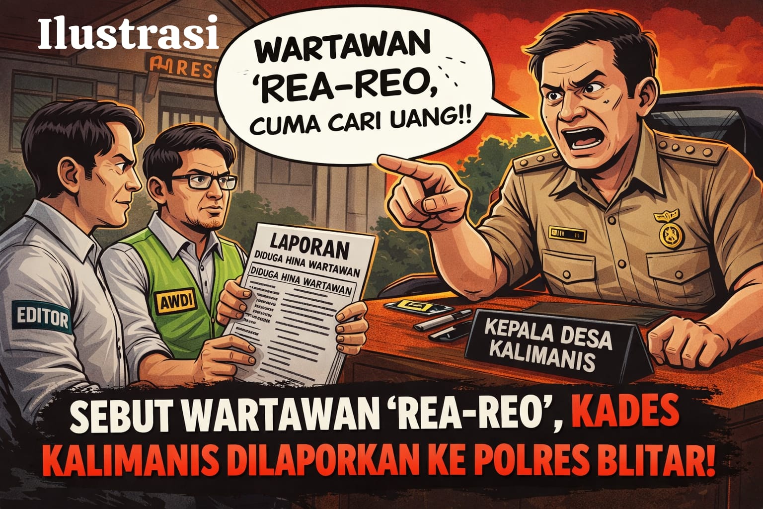 Pimpinan Redaksi Beritaglobalnews.com, Edi, didampingi Ketua organisasi pers Asosiasi Wartawan Demokrasi Indonesia (AWDI) DPC Mojokerto Raya, Dwijo Kretarto SE.MM, secara resmi melaporkan dugaan penghinaan terhadap profesi wartawan yang diduga dilakukan oleh Kepala Desa Kalimanis MJNO ke Kepolisian Resor Blitar pada Rabu (12/3/2026).